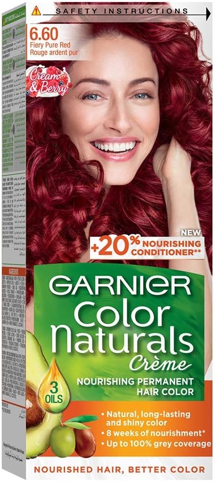 Garnier Hair Colour, مع 3 زيوت مغذية، غطاء رمادي، لون لامع يدوم طويلا، نتيجة طبيعية، لجميع أنواع الشعر، كريم كولور ناتشورالز، 6.60 أحمر ناري نقي